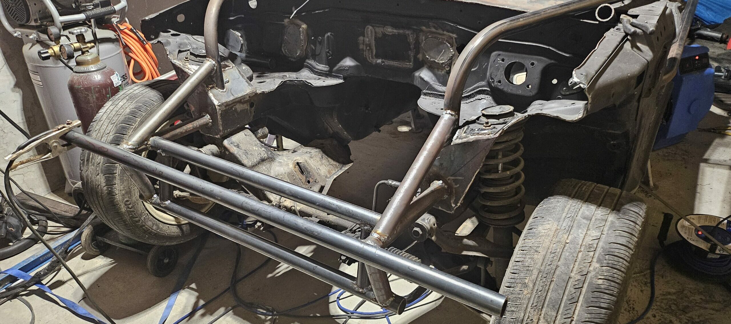 The tubular front bumper. The forward-most bar is the bumper, and you can see the lower bar the sway bar mounts will attach to. Everything is triangulated to the cage and frame.