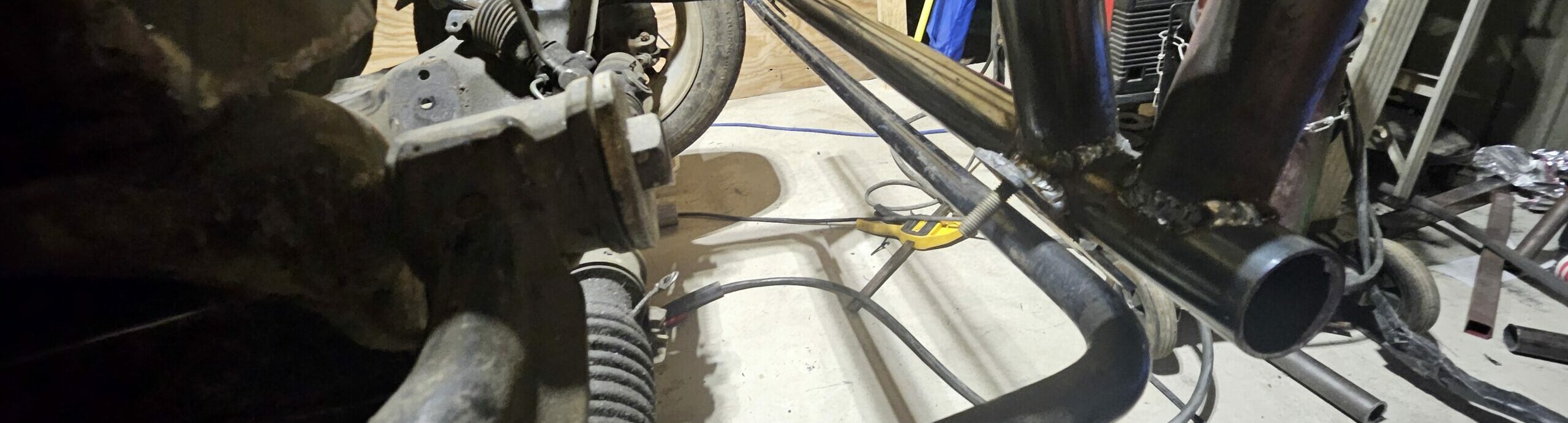 Before undertaking the last major fabrication of the ghettocet build, I had to take a few measurements and make one big decision. Namely, I forgot to measure the distance from the front frame to the front sway bar. I need to construct sway bar attachments along with the bumper. To get this measurement, I separated the engine from the front subframe. I then reattached the subframe and front suspension to the chassis. This allowed me to take measurements and verify placement as I constructed the front.