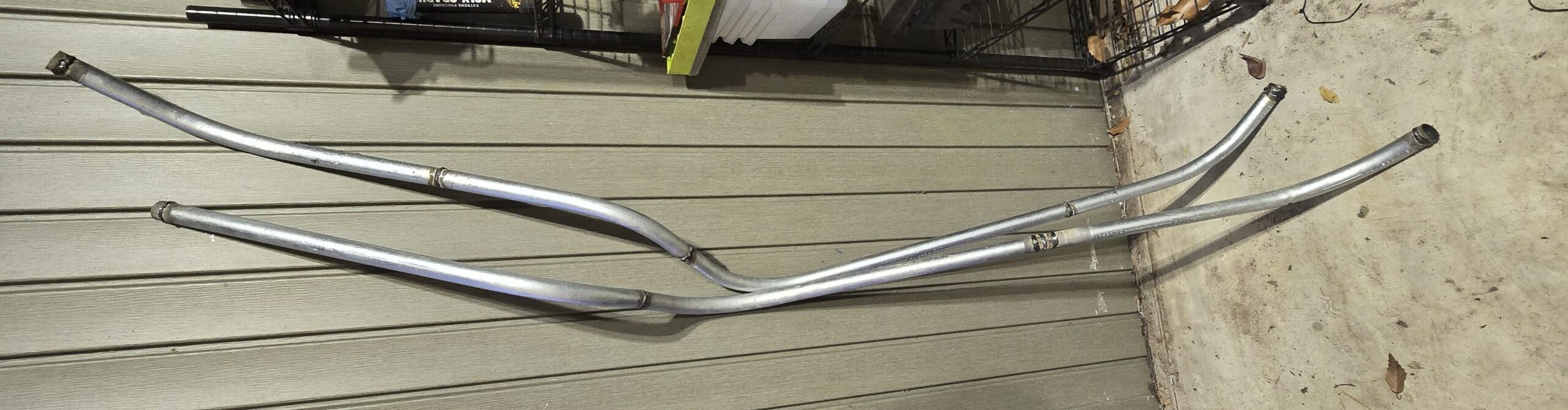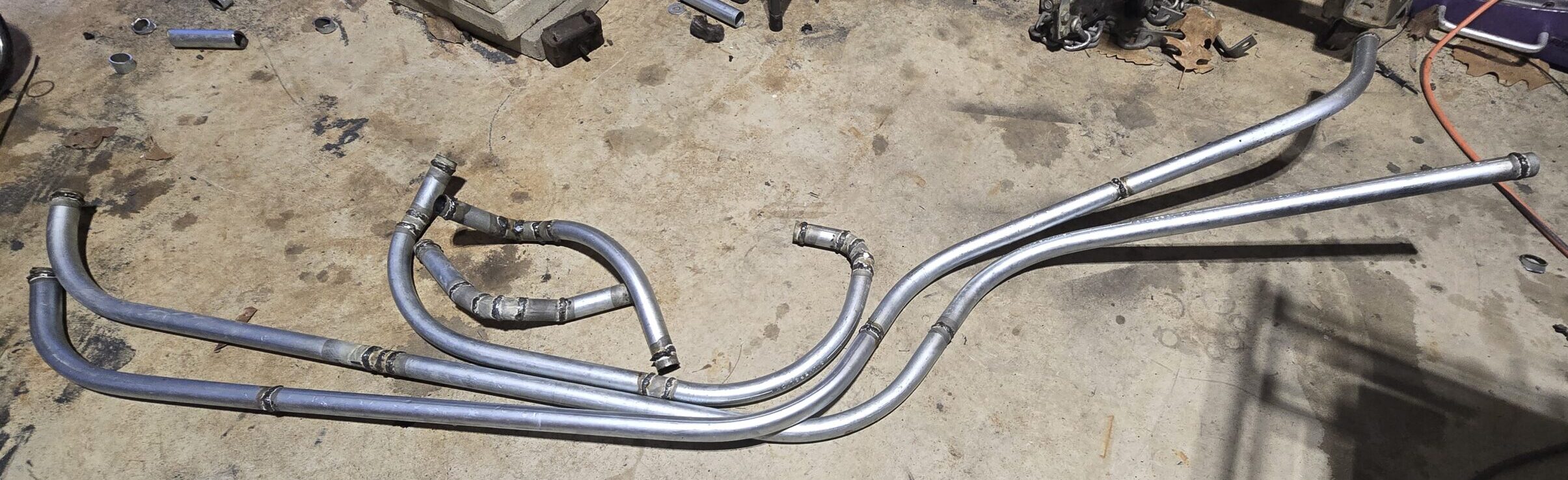 The engine and firewall tubing. The long tube is the cold side inlet and the two short ones are the firewall pass through. My bead roller wasn’t strong enough for the EMT so I welded a bead to each opening to secure the hoses and hold the clamps.