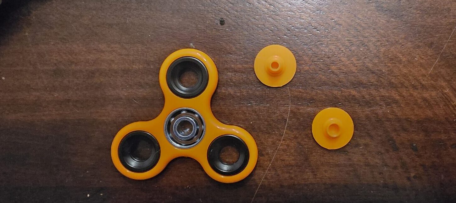 Starting with the fidget spinner, remove the two plastic covers from the center bearing. Then, press the bearing out of the spinner. I found that pushing a small screwdriver through the center of the bearing will help remove stubborn ones.